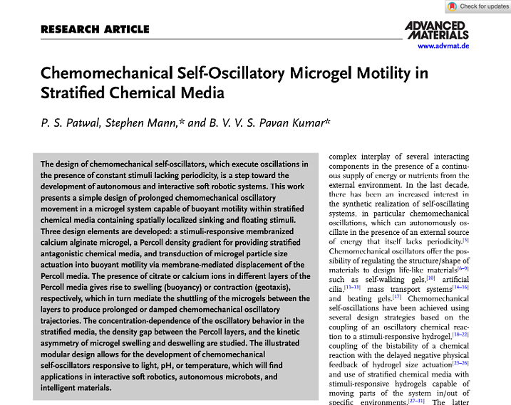 Patwal, P. S., Mann, S., & Kumar, B. V. V. S. P. (2025). Chemomechanical Self-Oscillatory Microgel Motility in Stratified Chemical Media. Advanced Materials, 37, 2415568 (J.I.F. 2025: 26.8). https://doi.org/10.1002/adma.202415568