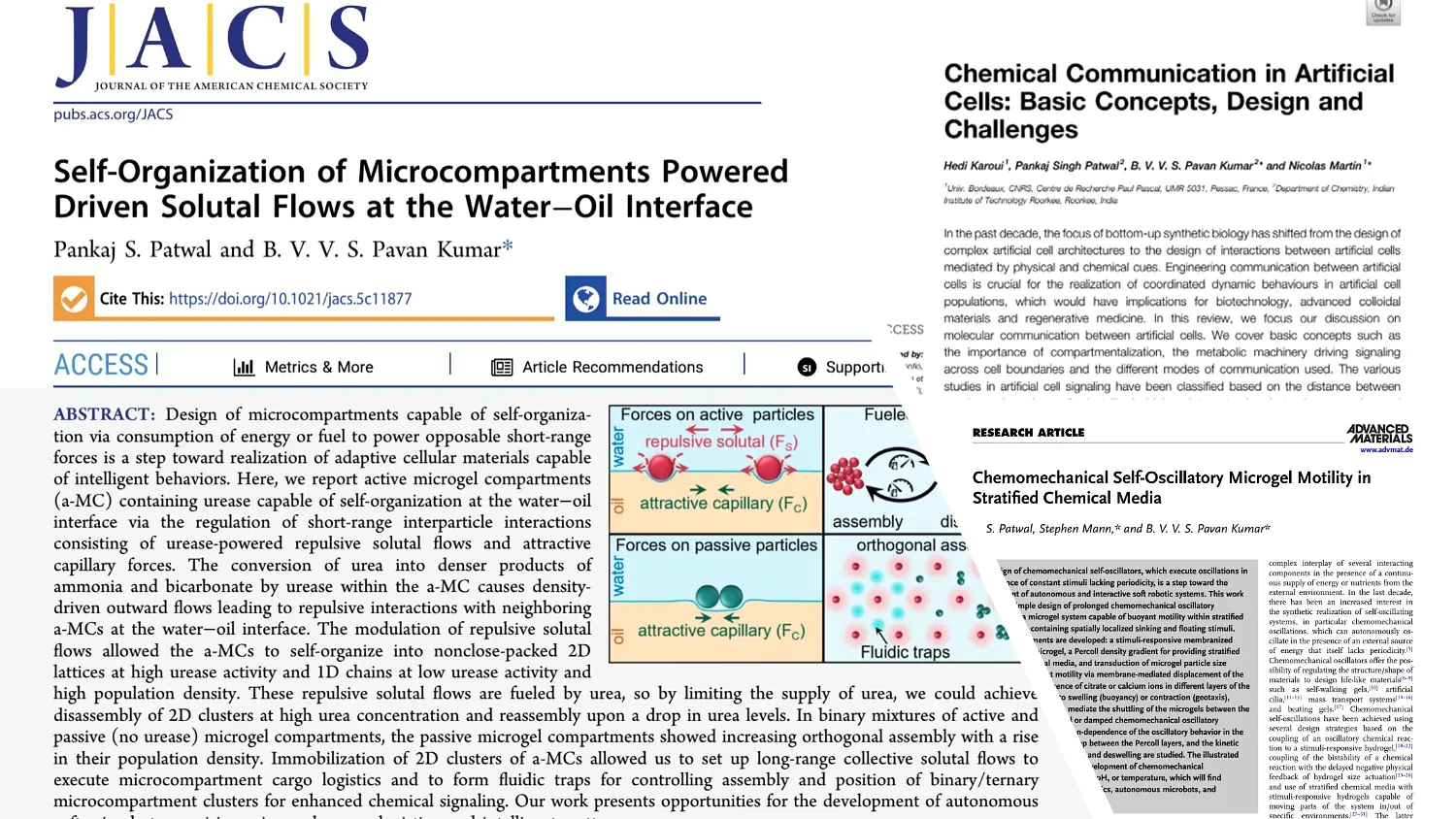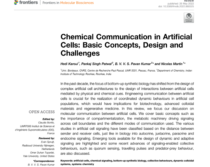 Karoui, H., Patwal, P. S., Pavan Kumar, B. V. V. S., & Martin, N. (2022). Chemical Communication in Artificial Cells: Basic Concepts, Design and Challenges. Frontiers in Molecular Biosciences, Volume 9 - 2022, (J.I.F. 2025: 4.0). https://doi.org/10.3389/fmolb.2022.880525